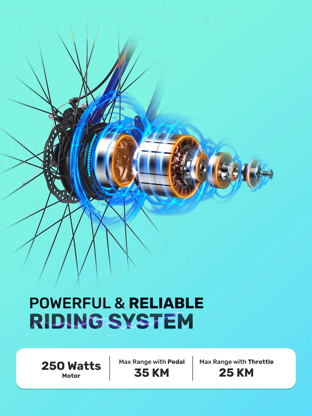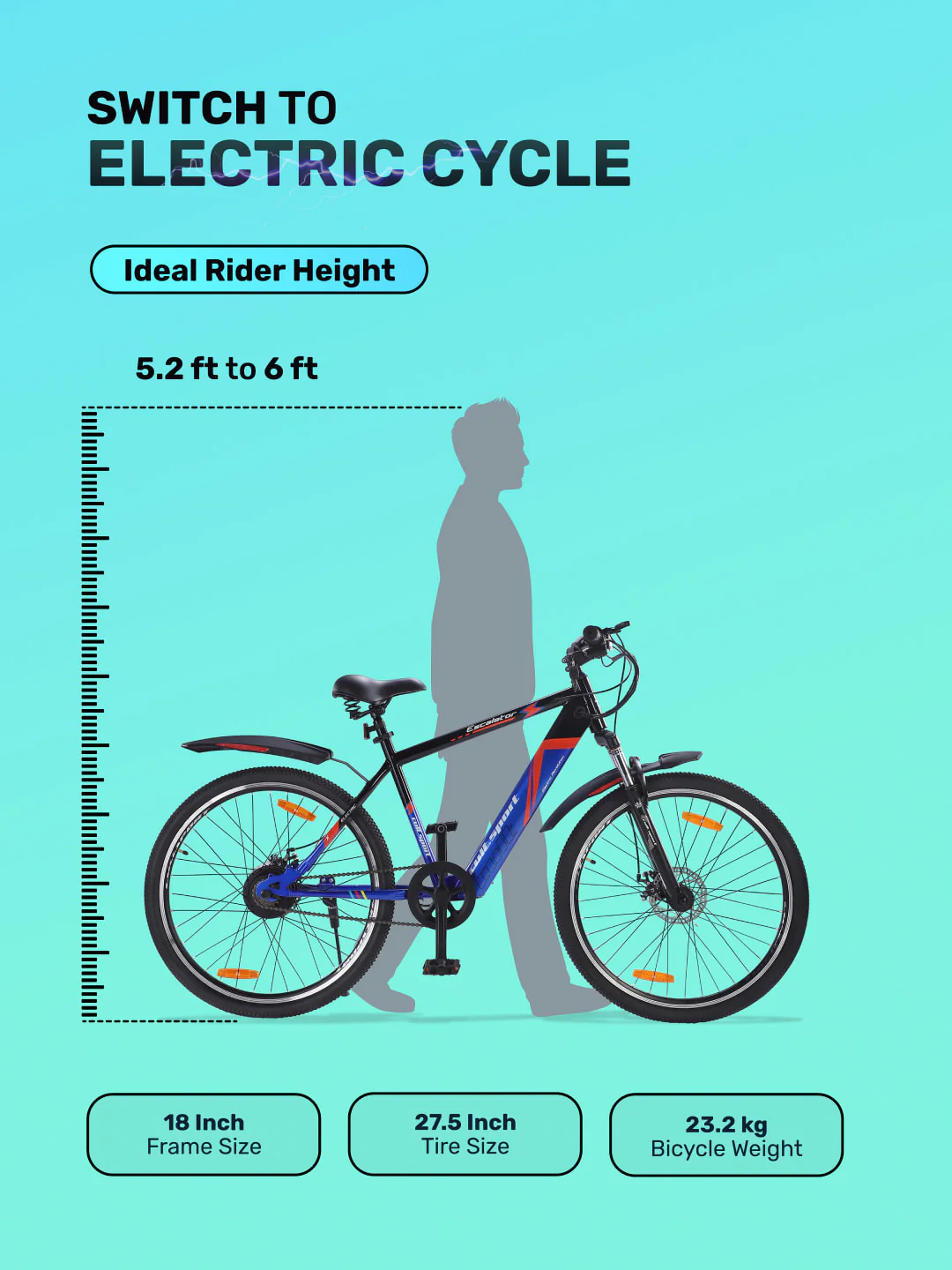 1)Fast Charging: With Cult Single Speed Electric Cycle with range of 25 km on throttle and 35 km on pedal assist. You can fully recharge the inbuilt Lithium-ion 36 V, 7.8 Ah, integrated battery in just 4 hours.2)Powerful Motor Performance: The Cult electric cycle is equipped with 36V/ 250 Watt powerful BLDC Motor that can boost the E cycle to a top speed of 25 kph. 3)The High-quality double disc brakes on both front and rear wheels ensure stable and quick braking. The disc brakes help you navigate safely during challenging situations such as a crowded market.4) The cycle comes with front & rear reflectors and strong double walled alloy rims along with 27.5 inches wide tyres which supports safe, comfortable riding and a major performance advantage on the road.5) Easily adjustable saddle height and an attractive grip offer superior comfort and well cushioned ride. The seat height can be adjusted via quick release clamp, without using any tools.